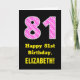 Cette carte de voeux d'anniversaire joyeuse et amusante design avec un grand numéro "81" avec un motif à rayures rose clair et rose foncé contenant des formes cardiaques sur l'avant. Le recto comporte également le message de voeux d'anniversaire "Joyeux 81e anniversaire", et un nom de destinataire personnalisé. L'intérieur comporte un message de voeux d'anniversaire modifiable, ou peut-être pourrait-il être effacé et laissé vide si un message doit être écrit à la main à la place. Une carte d’anniversaire personnalisable comme celle-ci pourrait être une façon amusante de reconnaître les quatre-vingt premiers ans de quelqu’un. Cela pourrait aussi être un choix amusant pour quelqu'un qui a un anniversaire qui tombe le jour de la Saint-Valentin (14 février), en raison de ses symboles et couleurs de coeur aimés. [~Z0000434]