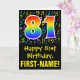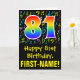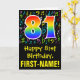 The Front of this fun, colorful, and vibrant red birthday greeting card designs large number "81" with a rainbow spectrum gradient inspecred pattern, along with the message "Happy 81st Birthday," et an editable recipient name. Le front has a colorful music notes and symbos pattern. The inside fean editable birthday greeting message, or could perhaps be cleared and left blank if a message is to be written by hand instead. A birthday card like this might be a fun way to send birthday wishes to a musician, singer composer, or somebody else who is celebrating their eighty first birthday. 2