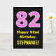 Cette carte de voeux amusante et joyeuse à thème d'anniversaire comporte un grand nombre de "82" avec un motif rayé contenant des formes cardiaques colorées rose foncé et rose clair sur le devant. Le premier affiche également le message de bienvenue "Joyeux 82e anniversaire" et un nom de destinataire personnalisable. L'intérieur comporte un message de salutation d'anniversaire personnalisable, ou peut-être pourrait-il être effacé et laissé vide si un message doit être écrit à la main à la place. Une carte d’anniversaire personnalisable comme celle-ci pourrait être une façon amusante d’envoyer un message pour célébrer le quatre-vingt-deuxième anniversaire de quelqu’un. Cela pourrait aussi être un choix amusant pour quelqu'un dont l'anniversaire tombe le 14 février (Saint-Valentin), en raison de ses symboles et couleurs de coeur aimés. [~Z0000434]