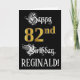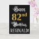 Le recto de cette carte de voeux d'anniversaire de luxe et formelle comporte le message "Happy 82nd Birthday", ainsi qu'un nom de destinataire personnalisé. Une partie du message est dans un texte de style script sophistiqué, le grand numéro "82nd" dispose d'un faux/imitation motif de look d'inspiration or, et l'arrière - plan est coloré en noir. L'intérieur a un message de voeux d'anniversaire modifiable, ou peut-être peut-être être effacé et laissé vide si un message doit être écrit à la main à la place. Une carte de voeux d’anniversaire somptueuse et customisée comme celle-ci pourrait être utilisée pour célébrer le quatre-vingt-deuxième anniversaire de quelqu’un. [~Z0000559]