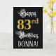 Le devant de cette carte de voeux d'anniversaire formelle et élaborée comporte le message "Happy 83rd Birthday", et un nom de destinataire modifiable. Une partie du message se trouve dans un texte orné de style script. Le grand numéro "83e" présente un motif d'allure imitation or. L'arrière - plan est noir de couleur. L'intérieur a un message de voeux d'anniversaire personnalisable, ou peut-être peut-être être effacé et laissé vide si un message doit être écrit à la main à la place. Une carte de voeux d’anniversaire customisée et opulente comme celle-ci pourrait être envoyée pour célébrer le quatre-vingt-troisième anniversaire de quelqu’un. [~Z0000559]