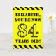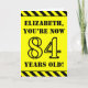 Le recto de cette carte de voeux d’anniversaire audacieuse et captivante comporte un nom personnalisé et le message "VOUS AVEZ MAINTENANT 84 ANS !" en texte de pochoir noir sur un arrière - plan de couleur jaune. Il y a aussi un motif rayé jaune et noir accrocheur aux bords supérieur et inférieur de l'avant. L'intérieur comporte un message de voeux d'anniversaire customisé, ou peut-être pourrait-il être effacé et laissé vide si un message doit être écrit à la main à la place. Une carte d'anniversaire comme celle-ci pourrait être une façon amusante d'envoyer des voeux d'anniversaire à quelqu'un qui célèbre son quatre-vingt-quatrième anniversaire. [~Z0000413]