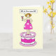 Une dame caricaturale aux cheveux bruns sur un gâteau géant rose et blanc. La dame dit que '85 est le nouveau 65'. L'image a un arrière - plan citron pâle.