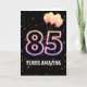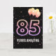 Ballons de fête et confettis sur arrière - plan noir avec le néon numéro 85 pour un 85ème anniversaire.