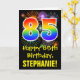 La face avant de cette conception de carte d'anniversaire excitante, amusante et colorée présente un grand nombre "85" ayant un motif inspiré d'un dégradé de spectre d'arc-en-ciel. Elle comporte également le message "Joyeux 85e anniversaire" et un nom de destinataire modifiable. L'avant présente en outre un motif de fond coloré inspiré de l'apparence de feux d'artifice de célébration éclatants. L'intérieur comporte un message de vœux d'anniversaire personnalisable, ou pourrait éventuellement être effacé et laissé vide si un message doit être écrit à la main à la place. Une carte d'anniversaire personnalisée comme celle-ci pourrait être un moyen amusant de reconnaître le quatre-vingt-cinquième anniversaire de quelqu'un. [~Z0000442]
