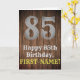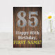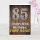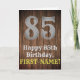 Cette carte de voeux d'anniversaire d'inspiration country et American Old West présente un grand numéro de look rustique "85", le message "Happy 85th Birthday", un nom personnalisé, et un faux/imitation grain de bois inspiré d'un arrière - plan motif. L'intérieur a un message de voeux d'anniversaire customisé, ou peut-être peut-être être effacé et laissé vide si un message doit être écrit à la main à la place. Une carte de voeux d’anniversaire customisée comme celle-ci pourrait être utilisée pour souligner le quatre-vingt-cinquième anniversaire de quelqu’un. [~Z0000469]