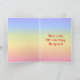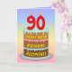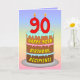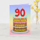 Cette carte de voeux d'anniversaire colorée et optimisée présente une représentation de type dessin animé d'un gâteau d'anniversaire à trois niveaux avec des bougies en forme de chiffres sur le dessus montrant le numéro "90", ainsi que le message "HAPPY 90TH BIRTHDAY", et un nom de destinataire modifiable. L'arrière - plan de l'avant a un motif multicolore pastel en arc-en-ciel inspiré du spectre dégradé. L'intérieur comporte un message de voeux d'anniversaire customisé, ou peut-être pourrait-il être effacé et laissé vide si un message doit être écrit à la main à la place. Une carte de voeux d’anniversaire joyeuse et modifiable comme celle-ci pourrait être utilisée pour célébrer le quatre-vingt-dixième anniversaire de quelqu’un. [~Z0000625]