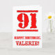 Ce design amusant de carte de voeux d'anniversaire comporte un grand numéro rouge "91" ayant une apparence inspirée par un timbre en caoutchouc, ainsi que le message de voeux d'anniversaire "HAPPY BANTHDAY", et un nom modifiable sur le devant. L'intérieur a un message de voeux d'anniversaire modifiable, ou peut-être peut-être être effacé et laissé vide si un message doit être écrit à la main à la place. Une carte de voeux d'anniversaire customisée comme celle-ci pourrait être une façon amusante d'offrir des voeux d'anniversaire à quelqu'un qui célèbre son quatre-vingt-onze anniversaire. [~Z0000524]