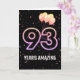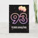 Ballons de fête et confettis sur arrière - plan noir avec le néon numéro 93 pour un 93ème anniversaire.