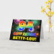 L'avant de cette carte de voeux d'anniversaire colorée, joyeuse et amusante comporte un grand nombre de "94" et le message "HAPPY BANTHDAY", tous deux ayant un dégradé arc-en-ciel inspiré colorant motif, ainsi qu'un nom de destinataire personnalisé jaune gras. Le front a également un motif arrière - plan multicolore inspiré par les feux d'artifice de célébrations éclatants. L'intérieur comporte un message de voeux d'anniversaire modifiable, ou peut-être pourrait-il être effacé et laissé vide si un message doit être écrit à la main à la place. Une carte d’anniversaire colorée et personnalisable comme celle-ci pourrait être une façon amusante de reconnaître le quatre-vingt-quatorzième anniversaire de quelqu’un. [~Z0000471]