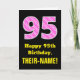 Cette carte de voeux amusante et joyeuse à thème d'anniversaire dispose d'un grand numéro "95" avec un motif rayé rose foncé et rose clair contenant des formes cardiaques sur le devant. Le recto contient également le message de voeux d'anniversaire "Joyeux 95e anniversaire", et un nom de destinataire personnalisé. L'intérieur comporte un message de voeux d'anniversaire customisé, ou peut-être pourrait-il être effacé et laissé vide si un message doit être écrit à la main à la place. Une carte d'anniversaire personnalisée comme celle-ci pourrait être une façon amusante d'envoyer des voeux d'anniversaire à quelqu'un qui célèbre son quatre-vingt-quinzième anniversaire. Cela pourrait aussi être un choix amusant pour quelqu'un dont l'anniversaire tombe le 14 février (Saint-Valentin), en raison de ses symboles et couleurs de coeur aimés. [~Z0000434]