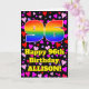 The front of this fun and happy birthday-themed greeting card design features a large number “96” having a rainbow spectrum gradient inspired pattern. It also features the message “Happy 96th Birthday,”, and a customizable name. The background of the front features a pattern of pink, red, and purple heart shapes of various sizes. The inside has a customized birthday greeting message, or could perhaps be cleared and left blank if a message is to be written by hand instead. A fun, customized birthday greeting card like this might be a fun way to send a birthday greeting message to somebody who is celebrating their ninety-sixth birthday. [~Z0000551]