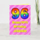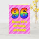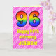 The front of this upbeat and festive 96th birthday-themed greeting card design features a large number "96" having a colorful pattern inspired by the look of a rainbow spectrum. It also features the message "Happy 96th Birthday,", and an editable recipient name. The background of the front features a dark pink and light pink stripes pattern containing loving pink heart shapes. The inside features a custom birthday greeting message, or could perhaps be cleared and left blank if a message is to be written by hand instead. A custom birthday card like this might be a fun way to send birthday wishes to somebody who is celebrating their ninety sixth birthday. [~Z0000416]