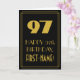 Cette apparence vintage/rétro et le design de la carte de voeux inspirée des années 2000, est décoré d'un grand style art déco inspiré du numéro "97", du message "HAPPY 97th BIRTHDAY", un nom personnalisé, et d'un motif de bordure composé de lignes fines sur le devant. L'avant a un arrière - plan noir. L'intérieur a un message de voeux d'anniversaire modifiable, ou peut-être peut-être être effacé et laissé vide si un message doit être écrit à la main à la place. Une carte de voeux personnalisable comme celle-ci pourrait être envoyée pour célébrer le quatre-vingt-dix-septième anniversaire de quelqu’un. [~Z0000499]