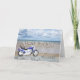Un moto bleu posé sur une plage aux nuages moelleux dans le ciel. Joyeux anniversaire écrit dans la roche réfléchi dans l'eau couchée sur le sable.