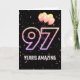 Ballons de fête et confettis sur arrière - plan noir avec le néon numéro 97 pour un 97ème anniversaire.