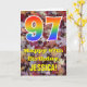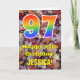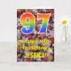 La face avant de cette conception de carte d'anniversaire colorée, rustique et inspirée de la nature présente un grand nombre « 97 » avec un motif inspiré d'un dégradé de spectre d'arc-en-ciel, ainsi que le message « Joyeux 97e anniversaire » et un nom personnalisé. L'arrière-plan de la face avant de la carte présente un motif rustique de feuilles d'automne tombées. L'intérieur comporte un message de vœux d'anniversaire personnalisé, ou pourrait éventuellement être laissé vierge si un message doit être écrit à la main à la place. Une carte d'anniversaire personnalisée comme celle-ci pourrait être un moyen amusant d'envoyer des vœux d'anniversaire à quelqu'un qui célèbre son quatre-vingt-dix-septième anniversaire.
