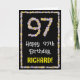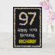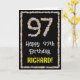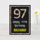 La façade de cette carte de voeux d'anniversaire fleurie et d'inspiration nature présente le message "Joyeux 97e anniversaire" et un nom de destinataire personnalisé. Le grand numéro "97" et la bordure à l'avant comportent tous deux des icônes de fleurs. L'intérieur a un message de voeux d'anniversaire personnalisé, ou peut-être peut-être être effacé et laissé vide si un message doit être écrit à la main à la place. Une carte de voeux amusante, customisée et florale comme celle-ci pourrait être utilisée pour célébrer le quatre-vingt-dix-septième anniversaire de quelqu’un. [~Z0000648]
