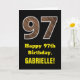 Cette conception de carte de vœux rustique et amusante pour un anniversaire présente un grand nombre "97" avec un motif de style inspiré du grain de bois imitation sur le devant. Le devant présente également le message de vœux d'anniversaire "Joyeux 97e Anniversaire" et un nom de destinataire personnalisable. L'intérieur présente un message de vœux d'anniversaire modifiable, ou pourrait éventuellement être effacé et laissé vide si un message doit être écrit à la main à la place. Une carte d'anniversaire personnalisée comme celle-ci pourrait être un moyen amusant d'envoyer des vœux d'anniversaire à quelqu'un qui célèbre son quatre-vingt-dix-septième anniversaire.