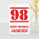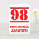 Ce design amusant de carte de voeux d'anniversaire comporte un grand numéro rouge "98" ayant une apparence inspirée par un timbre en caoutchouc, ainsi que le message de voeux d'anniversaire "HAPPY BANTHDAY", et un nom personnalisé sur le devant. L'intérieur a un message de voeux d'anniversaire personnalisable, ou peut-être peut-être être effacé et laissé vide si un message doit être écrit à la main à la place. Une carte de voeux d'anniversaire amusante et modifiable comme celle-ci pourrait être une façon amusante d'envoyer des voeux d'anniversaire à quelqu'un qui célèbre son quatre-vingt-dix-huitième anniversaire. [~Z0000524]