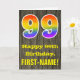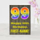 L'avant de cette conception de carte de vœux d'anniversaire colorée mais rustique comporte un grand nombre "99" avec un motif inspiré d'un dégradé de spectre d'arc-en-ciel, ainsi que le message "Joyeux 99e anniversaire" et un nom de destinataire modifiable. L'avant présente un fond représentant un motif de faux grain de bois rustique. L'intérieur comporte un message de vœux d'anniversaire personnalisé, ou pourrait éventuellement être effacé et laissé vide si un message doit être écrit à la main à la place. Une carte d'anniversaire personnalisable comme celle-ci pourrait être un moyen amusant de célébrer le quatre-vingt-dix-neuvième anniversaire de quelqu'un. [~Z0000419]