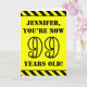 Le devant de cette carte de voeux d’anniversaire, qui attire l’attention et qui est audacieuse, comporte un nom personnalisable et le message "VOUS AVEZ MAINTENANT 99 ANS !" en texte de style pochoir noir sur un arrière - plan de couleur jaune. Il y a aussi un motif rayé noir et jaune accrocheur aux bords supérieur et inférieur de l'avant. L'intérieur comporte un message d'anniversaire personnalisé, ou pourrait être effacé et laissé vide si un message doit être écrit à la main à la place. Une carte d’anniversaire personnalisée comme celle-ci pourrait être une façon amusante de souligner le quatre-vingt-dix-neuvième anniversaire de quelqu’un. [~Z0000413]