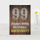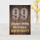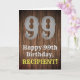 Ce look américain de l'Ancien Ouest et le design de carte de voeux d'anniversaire d'inspiration campagnarde comprend un grand numéro de look rustique "99", le message "Happy 99th Birthday", un nom personnalisé, et un faux/imitation grain de bois inspiré look motif arrière - plan. L'intérieur a un message de voeux d'anniversaire personnalisé, ou peut-être peut-être être effacé et laissé vide si un message doit être écrit à la main à la place. Une carte de voeux d'anniversaire personnalisée comme celle-ci pourrait être une façon amusante d'envoyer un message d'anniversaire à quelqu'un qui célèbre son quatre-vingt-dix-neuvième anniversaire. [~Z0000469]