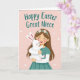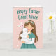 This card shows an animated-style girl with long brown hair and a small flower headband hugging a fluffy white long-eared bunny 🐰. Her eyes are closed in a sweet smile, and the bunny presses its little face to her cheek as if returning the affection. The background is a soft blush pink with tiny white stars and faint circular accents that give the scene a gentle, dreamy setting 🌷. The girl wears a simple teal top that stands out softly against the pale backdrop without pulling attention from the cuddle. Subtle details like rosy cheeks and lightly outlined paw pads add charm while keeping the look soft and cozy. Near the top, a festive greeting is placed in flowing teal lettering, centered above the characters. The bunny’s long ears curve upward against the pink background, with small white stars scattered around them.