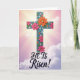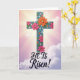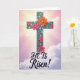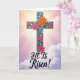 Ce dessin montre une grande croix stylisée centrée sur la carte, avec un aspect texturé, presque sculpté, qui lui donne de la profondeur. Des fleurs roses vives et oranges chaudes se regroupent le long de la croix, leurs pétales en couches suggérant une étreinte douce et affectueuse, tandis que des formes florales sarcelle ajoutent une touche amicale et familière. Des points et des accents bleu clair se trouvent autour des fleurs, comme de petites notes de célébration, avec une 🌷 glissée dans l'atmosphère printanière. Derrière, le ciel passe du rose doré près du haut à un lavande calme plus bas, avec de minces nuages qui dérivent à travers. Des rayons de lumière se propagent depuis l'arrière de la partie supérieure de la croix, formant un effet de halo doux qui attire l'œil vers le haut. Près du bas, les mots « IL EST Ressuscité ! » sont placés en grandes lettres, dans une encre foncée qui se détache clairement sur le fond plus clair