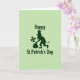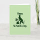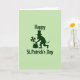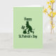 Conçu avec un fond vert citron pastel doux, cette carte de la Saint-Patrick est centrée sur la silhouette d'un lutin vert foncé dans une pose vive et légèrement effrontée. Il porte un haut-de-forme et une barbe touffue, se penchant vers un pot rond comme s'il partageait un secret avec quelqu'un juste hors champ. Entre ses mains se trouve un trèfle à quatre feuilles ☘️, tenu avec une touche soigneuse qui ressemble à une petite offrande affectueuse. La palette à deux tons garde la scène simple et facile à regarder, tout en évoquant ces verts irlandais luxuriants 💚. La phrase « Joyeuse Saint-Patrick » apparaît en haut et en bas, dans une police serif vert foncé qui correspond au lutin. Les lettres s'assoient proprement au-dessus et en dessous de l'illustration, encadrant la figure et le pot comme une bordure soignée. Le bord du chapeau du lutin, la courbe de la
