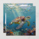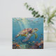 A sea turtle themed notecard that is blank on one side and has an illustration of a sea turtle under a calm teal sea swimming among the coral on the front.