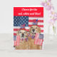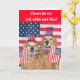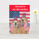 Ce quatrième de carte de juillet comporte les chiens d'arrêt d'or habillés dans les bandeaux patriotiques et des colliers tenant de grands drapeaux américains dans leurs bouches. Le texte lit, des "acclamations pour le rouge, blanc et bleu !" et "voici à un 4ème glorieux !".