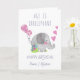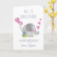 Funny birthday card, titled "Age is irrelephant". Design features a whimsical illustration of a cute elephant with birthday balloons, love hearts and flowers. You can personalize the card for anyone you want on the front and you can also write your own message inside.