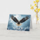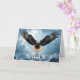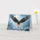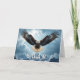 Un aigle chauve avec des ailes étirées vole gracieusement sur une gamme de montagnes enneigées avec le texte SOAR. Le texte est modifiable.