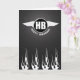 HB dans un cercle argenté noir, Joyeux anniversaire en dessous. Les Flames d'argent décorent le fond de la carte. Le noir est une image métallique. Une belle carte pour le fan de moto.