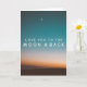 Simple et élégant "Amusez-vous à la lune et au dos", une carte de voeux inspirante avec une typographie moderne et une photo d'un ciel de nuit bleu vif et acier, avec la lune blanche brillant dans le ciel, avec des étoiles scintillantes, au-dessus d'une chaîne de montagnes de silhouette sombre avec un coucher de soleil rose orangé inspiré par l'amour, le romantisme et le bonheur.
