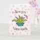Exprimez-vous avec une carte de vœux tendance et drôle. Mignon et doux, ce design personnalisé présente le texte "Aloe (Je t'aime) you Vera (très) much" dans une police sérif fantaisiste et une illustration de dessin animé plat et mignon d'une plante d'aloe vera en pot souriante avec des joues rougissantes et trois cœurs roses qui se répandent sur un motif de fond de cœurs roses clairs dispersés.