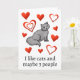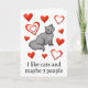Une carte de voeux amusante avec l'illustration d'un chat gris portant les mots "J'aime les chats et peut-être 3 personnes" en dessous avec les coeurs tout autour. L’intérieur dit : "Et vous êtes l’un d’entre eux! Bonne Saint Valentin". Tout le texte peut être customisé ou supprimé.