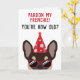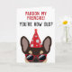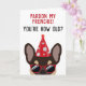 Cette drôle de carte d'anniversaire de bulldog en France est sûr de mettre un sourire sur le visage du garçon ou de la fille d'anniversaire qui a un sens de l'humour. Le dessin est illustré d'un cool à l'air brun et de couleur bronze, vêtu d'un casquette de fête rouge et de lunettes de soleil avec la mention "Pardon ma frenchie! Vous êtes comme vieux" écrit sur le devant. Ce design est également disponible avec différents bulldogs français colorés.
