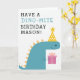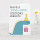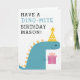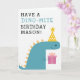 Carte d'anniversaire Dinosaure bleu drôle et mignonne avec un dinosaure bleu portant un casquette de fête et portant un cadeau d'anniversaire. Texte dit "Avoir un anniversaire DINO-MITE" Vous pouvez ajouter le nom de l'enfant d'anniversaire sous cela. Le texte est facilement modifiable en ligne.