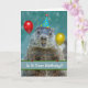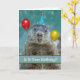 Amusant Joyeux Anniversaire sur Groundhog Day, carte de voeux papier. Est-ce ton anniversaire ? Encore ? La carte présente une photo d'un marmotte portant un casquette de fête d'anniversaire et flanquée d'un ballon rouge et jaune. Customisez le texte avant et intérieur comme vous le souhaitez avant d'acheter. Copyright © Shoaff Ballanger Studios, 2021.
