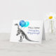 Drôle carte d'anniversaire moderne, avec un squelette de dinosaure portant des ballons bleus avec la légende "BIEN FAIT - pour être né il y a de nombreuses années !". Dans le message dit Joyeux anniversaire. Tout le texte peut être personnalisé.