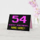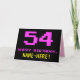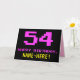 Le recto de cette conception de carte de vœux thématique d'anniversaire amusante, geek et ringarde comporte un grand nombre "54" et le message "JOYEUX ANNIVERSAIRE," de couleur rose, ainsi qu'un nom de destinataire éditable en jaune gras. Le texte présente une apparence inspirée par les graphismes vintage de style 8 bits d'ordinateurs et de jeux vidéo des années 1970 et 1980, et le fond est de couleur noire. L'intérieur comporte un message de vœux d'anniversaire personnalisé, ou pourrait éventuellement être effacé et laissé vide si un message doit être écrit à la main à la place. Une carte d'anniversaire personnalisée et idiote comme celle-ci pourrait être un moyen amusant d'envoyer un message pour célébrer le cinquante-quatrième anniversaire de quelqu'un.