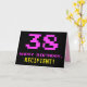 Le recto de cette carte de voeux amusante, geek et nerdy à thème d'anniversaire comporte un grand numéro "38" et le message "HAPPY BANTHDAY", couleur rose, avec un nom de destinataire jaune gras modifiable. Le texte présente un look inspiré de celui de la vidéo 8 bits rétro style vidéo/jeu informatique des années 1970 et 1980, et l'arrière - plan est noir de couleur. L'intérieur comporte un message de voeux d'anniversaire customisé, ou peut-être pourrait-il être effacé et laissé vide si un message doit être écrit à la main à la place. Une carte d’anniversaire personnalisée comme celle-ci pourrait être une façon amusante de reconnaître le trente-huitième anniversaire de quelqu’un. [~Z0000478]