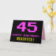 Le devant de cette carte de voeux amusante, nerveuse et geeky à thème d'anniversaire comporte un grand numéro rose "45", avec le message "HAPPY BANTHDAY," en rose, et un nom de destinataire jaune gras modifiable. Le texte a un aspect inspiré de celui de jeu informatique et de jeux vidéo de style 8 bits vintage des années 1970 et 1980, et l'arrière - plan est en noir coloré. L'intérieur comporte un message d'anniversaire personnalisé, ou pourrait être effacé et laissé vide si un message doit être écrit à la main à la place. Une carte d’anniversaire personnalisée comme celle-ci pourrait être une façon amusante de reconnaître le quarante-cinquième anniversaire de quelqu’un. [~Z0000478]