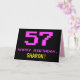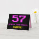 Le devant de cette carte de voeux amusante, nerveuse et geeky à thème d'anniversaire comporte un grand nombre de "57" et le message "HAPPY BANTHDAY", couleur rose, avec un nom de destinataire personnalisé jaune gras. Le texte présente un look inspiré de celui des graphismes vintages de jeux vidéo et d'ordinateur 8 bits des années 1970 et 1980, et l'arrière - plan est en noir coloré. L'intérieur comporte un message de voeux d'anniversaire modifiable, ou peut-être pourrait-il être effacé et laissé vide si un message doit être écrit à la main à la place. Une carte d'anniversaire ridicule comme celle-ci pourrait être une façon amusante d'envoyer des voeux d'anniversaire à une femme ou à quelqu'un d'autre qui célèbre son cinquante-septième anniversaire. [~Z0000478]