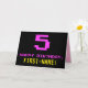 Le devant de cette carte de voeux d'anniversaire amusant, geek et nerdy comporte un grand numéro "5" et le message "HAPPY BANTHDAY", couleur rose, avec un nom de destinataire personnalisé jaune gras. Le texte a un look inspiré de celui des graphismes classiques de style 8 bits d'ordinateur/jeu vidéo des années 1970 et 1980, et l'arrière - plan est noir de couleur. L'intérieur comporte un message d'anniversaire personnalisé, ou pourrait être effacé et laissé vide si un message doit être écrit à la main à la place. Une carte d’anniversaire personnalisée comme celle-ci pourrait être une façon amusante de reconnaître le cinquième anniversaire de quelqu’un. [~Z0000478]
