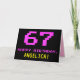 Le devant de cette carte de voeux amusante, geek et nerdy à thème d'anniversaire comporte un grand nombre de "67" et le message "HAPPY BANTHDAY", couleur rose, avec un nom de destinataire jaune gras modifiable. Le texte a une apparence inspirée de celle de graphiques vidéo/jeux vidéo 8 bits vintages des années 1970 et 1980, et l'arrière - plan est noir de couleur. L'intérieur comporte un message de voeux d'anniversaire modifiable, ou peut-être pourrait-il être effacé et laissé vide si un message doit être écrit à la main à la place. Une carte d’anniversaire personnalisable comme celle-ci pourrait être une façon amusante de célébrer le soixante-septième anniversaire de quelqu’un. [~Z0000478]