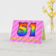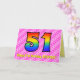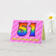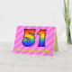 Cette carte de voeux de 51e anniversaire, à la fois optimisée et festive, a une façade avec un grand numéro "51", avec un motif coloré inspiré du spectre arc-en-ciel, sur un joyeux rose clair et rose foncé des formes coeur rayé arrière - plan motif. Le recto comporte également le message "Joyeux 51e anniversaire", suivi d'un nom de destinataire personnalisé. L'intérieur comporte un message d'anniversaire personnalisé, ou pourrait être effacé et laissé vide si un message doit être écrit à la main à la place. Une carte d'anniversaire personnalisée comme celle-ci pourrait être une façon amusante et heureuse d'envoyer des voeux d'anniversaire à quelqu'un qui célèbre son cinquante et unième anniversaire. [~Z0000418]
