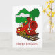 Un mignon train de dessin animé avec le numéro 9 à l'avant et la fumée venant de la cheminée et des arbres dans l'arrière - plan.